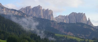 Gut erholt ging es vom Hotel in Moena aus erst einmal recht gemütlich 20 km im Fassa Tal hinauf (1. Bild: Blick zurück zur Rosengarten Gruppe).